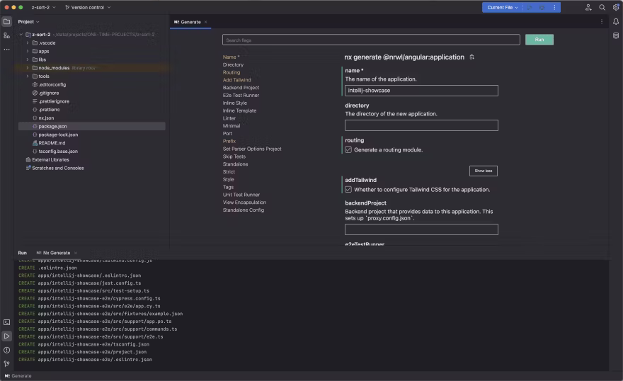 Another major part of Nx Console is the Generate UI. Instead of combing through CLI commands to fit your specific use-case, you can use the form-based view it provides. It's a separate web application (currently built with Angular) that runs inside VSCode as a webview. Again, being a standalone application means that we didn't have to rewrite it completely in order to integrate it into JetBrains-based editors!
